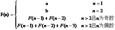 这年头,什么东西都玩山寨,我们也来凑个热闹吧。菲波那契数列你当然是熟悉的,那么看一个“山寨”菲波那契数列吧,它的递推式如下: 式中a和b是常数。给定a、b和n,计算对应的F(n) 的值。